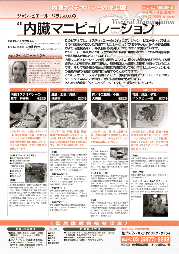 医療従事者とJOA会員限定でバラルD.O.の内臓マニピュレーションのビデオ4本セットを処分大特価の50%OFFで販売中です。
